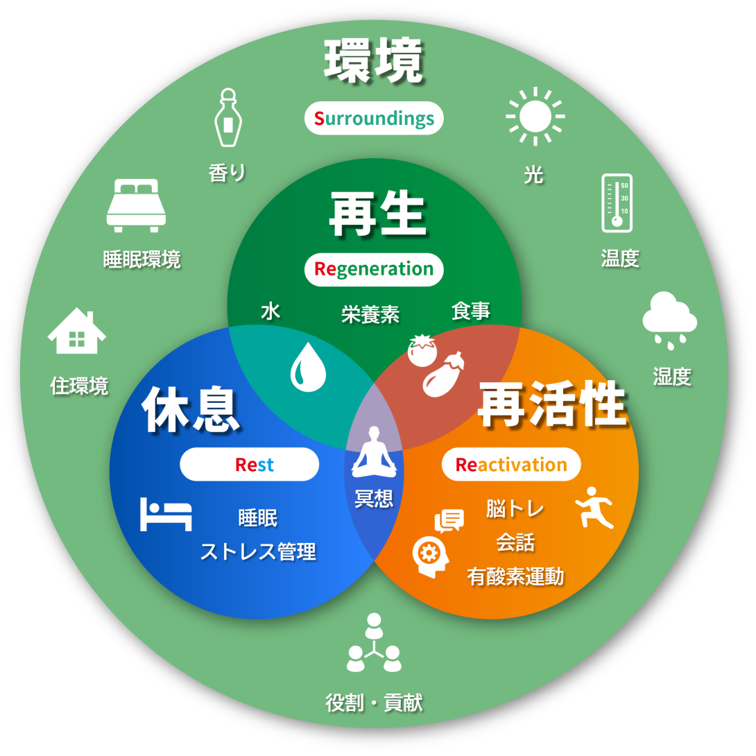 3ReSプログラムでは、リコード法をベースとして、独自の3ReS用の食事レシピの開発や創業より取り組んでいるくもん学習療法の実施、その他生活習慣の改善によりご利用いただける皆様に世界最高水準の認知症ケアを提供しております。